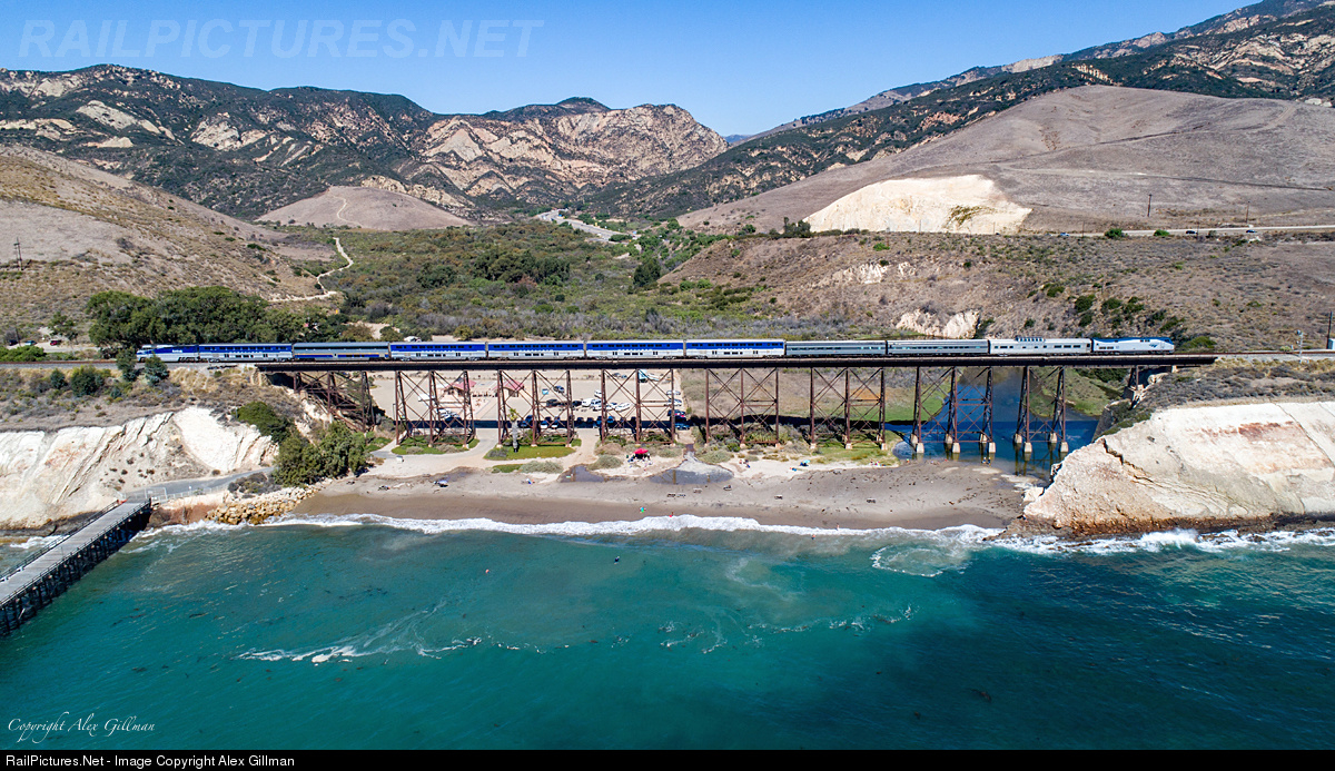 Living up to its name, Amtrak's Pacific Surfliner 'surfs' along the California coast line as it races across the iconic trestle at Gaviota in the afternoon light with the private cars "Overland Trail," "Pacific Trail" and "Silver Splendor" and an extra Amtrak locomotive bring up the rear.