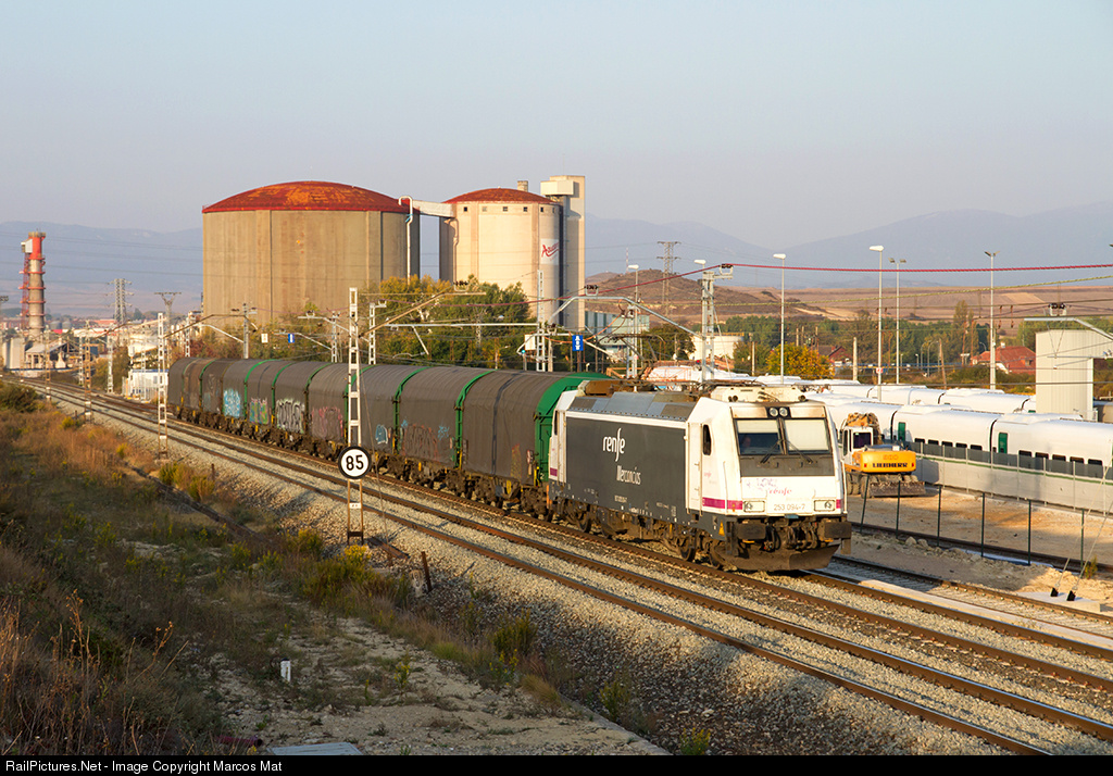 | Steel freight Trasona-Irún in charge of the TRAXX 253.094. Near the freight you can see some of the compositions of the train of High speed to Mecca, manufactured by Talgo in its facilities of Rivabellosa. |