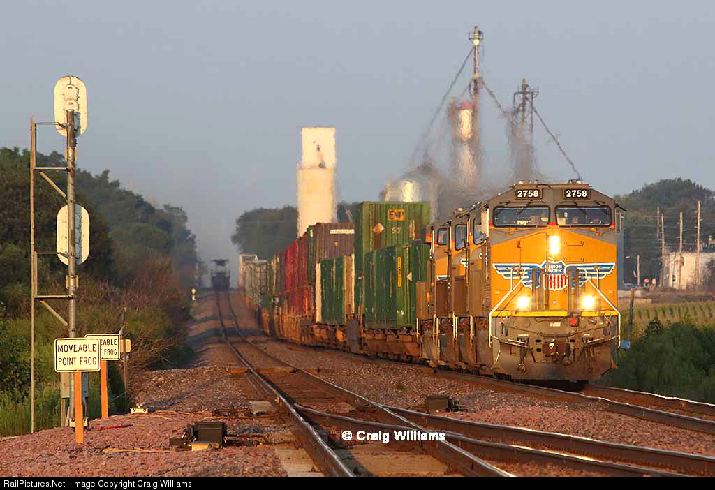 | The hot Z-train bound for Oakland, CA, rolls out of Calamus at high rate of speed. The crew is only about 25 miles into their all evening trek across Iowa from the east side to the west side to the next crew change at Missouri Valley, IA. Calamus is located at MP 32 on the UP Clinton Sub in eastern Iowa. |