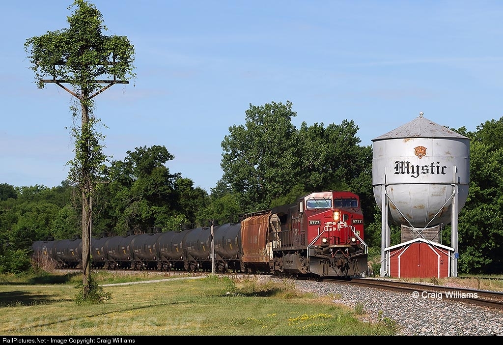 | CP empty oil train passes thru the small town of Mystic in south-central Iowa. The train races north on the Laredo Sub enroute to Ottumwa for the next crew change. This train is running 1x2 in DP setup. Mystic was a huge coal mines area in the late 1800's into early 1900's and the MILW built the line thru here in 1887. |