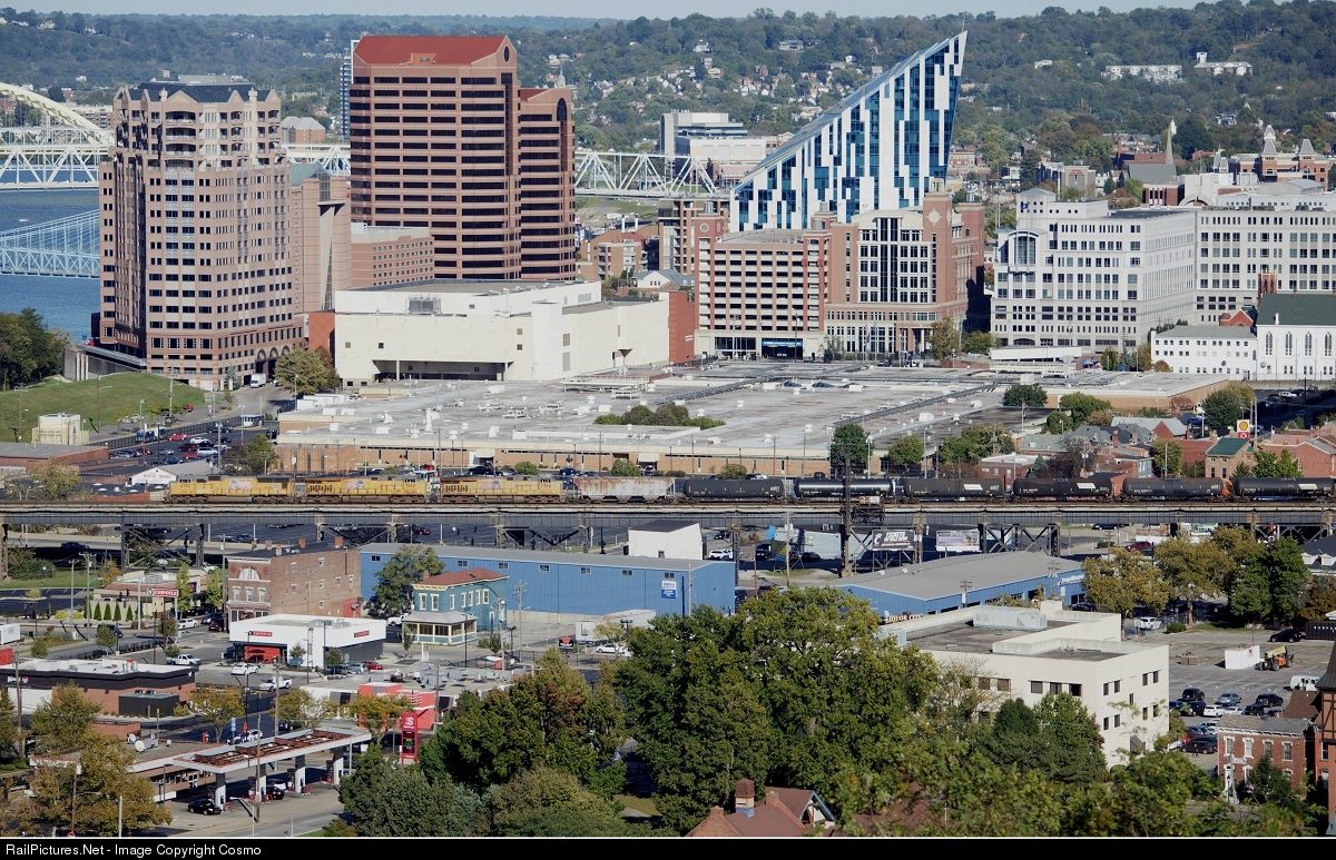 With the Covington Skyline in the Background, K492 crosses the C&O Bridge over the Ohio River into Cincinnati with a trio of Union Pacific motors.