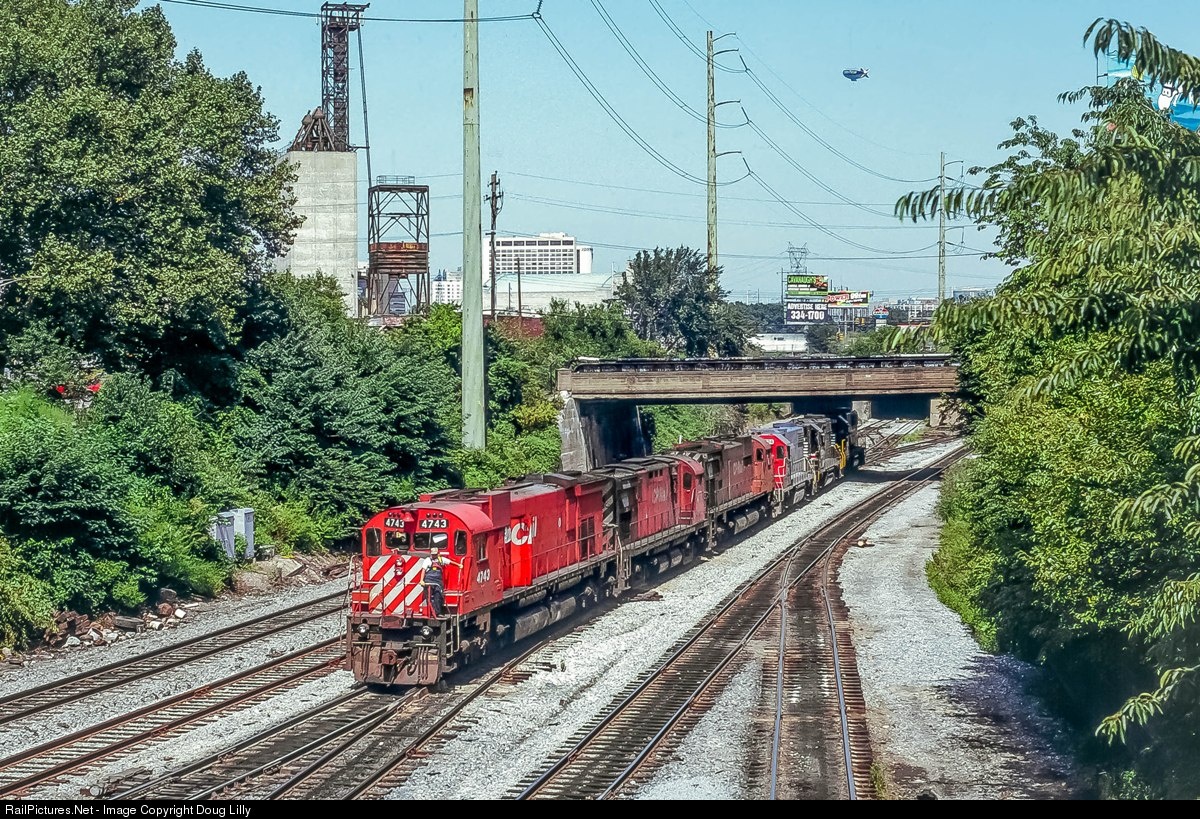 Some railfans use the moniker “big” to refer to six-axle Alco and MLW Century-type units. Here a Canadian Pacific “big” moves to attach to its train in CSX’ East Side Yard in Philadelphia, while a Metlife blimp tours around the city in the background. The Phillies had a home stand against the Astros that weekend, and I believe that is what brought the dirigible to town.