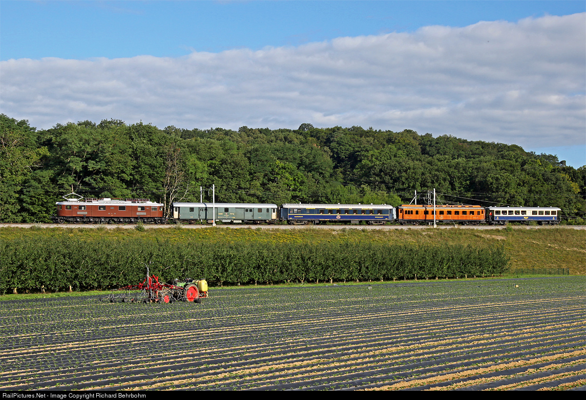 Former BLS Ae 6/8 No. 208 (operated today by Swisstrain S.A.) leads a private charter train with a former international baggage car, two dining cars, one in livery of CIWLT, the second is a teakwood car, and at the end a passenger car rebuilt in 2012.