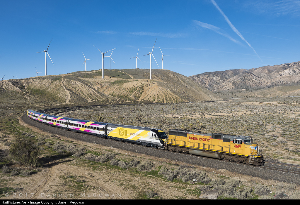 With a Siemens built Brightline trainset in tow, UP SD70M 4619 leads the consist around the curve at Warren, several miles north of Mojave, CA.