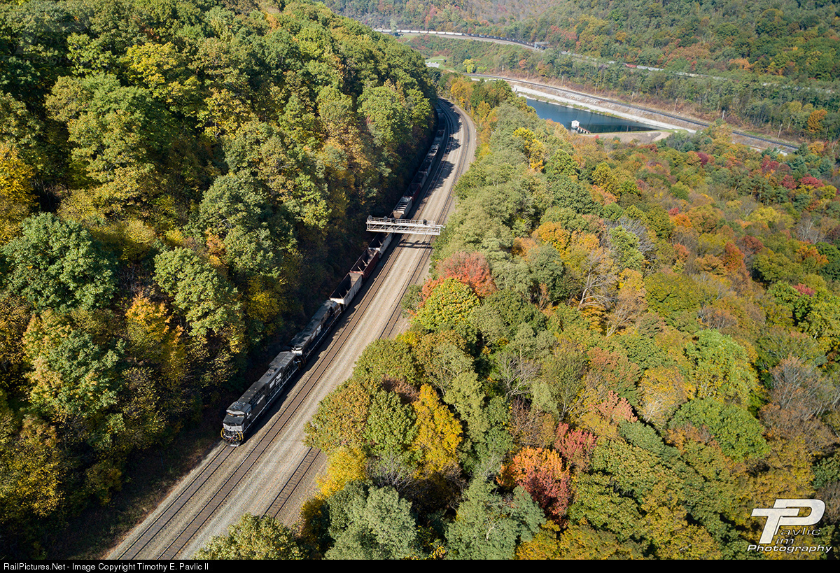 One of Norfolk Southern's AC44C6M units, rebuilt from a D9-40C by GE Fort Worth, leads an empty coal bucket out of the west leg of Horseshoe Curve. The Curve, built by the Pennsylvania Railroad and opened to traffic in 1854, is on its fourth owner and continues to serve as vital east-west rail link in the Northeast. Like this one, most of the trains seen here are long enough that the head end exits the curve before the rear enters it--that's the same train upper right beyond the reservoir, albeit at a much lower elevation.