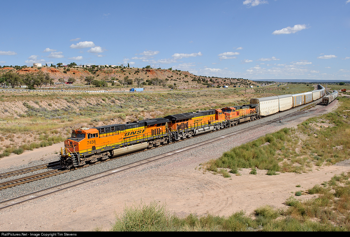 | BNSF ES44DC 7456 leads a Q train in disguise west on the Gallup Sub. The Clovis-Richmond Q train is quite often half intermodal and half autos, but on this day it was solid autos. |