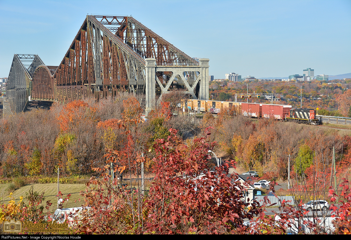 CN 516 comes off the Quebec Bridge, with 7 cars pulled by an old EMD GP9RM built in 1959.
