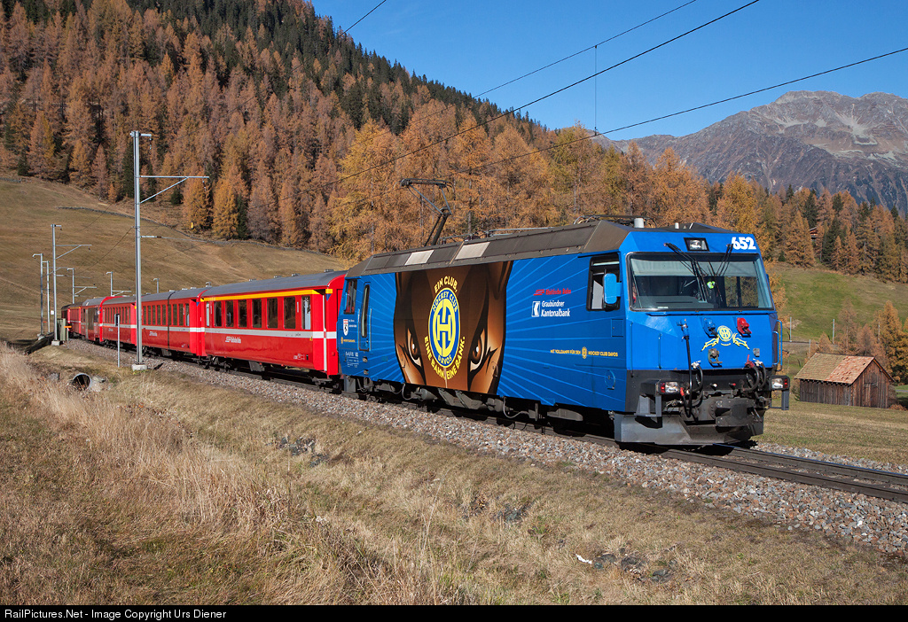 | Ge 4/4 III 652, painted in the publicity paint scheme for the HCD (Hockey Club Davos), is leading RE 1033 from Landquart to Davos Platz. |