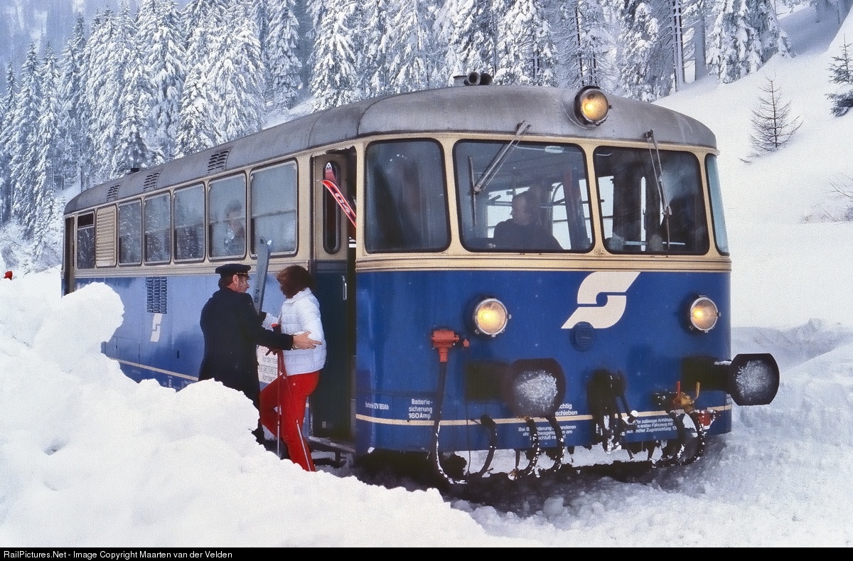 ÖBB 5081.565 during the stop at Präbichl. This day train 4106 from Leoben Hbf to Hieflau was full of people who went skiing. They all left the "Schienenbus" at Präbichl, highest point of the line and went back on their skies. This line is already closed a long time ago. This photo was made in the last years of exploitation. Until the late seventies, this line was a rack railway, with steam locomotives operating trains with iron ore over the mountain. A short time diesel locomotives of the series 2143 with a reinforced braking system were used to to the job, not using anymore the cog system. After that there was only passenger service with the railbusses, three times a day, until the closure of the line.