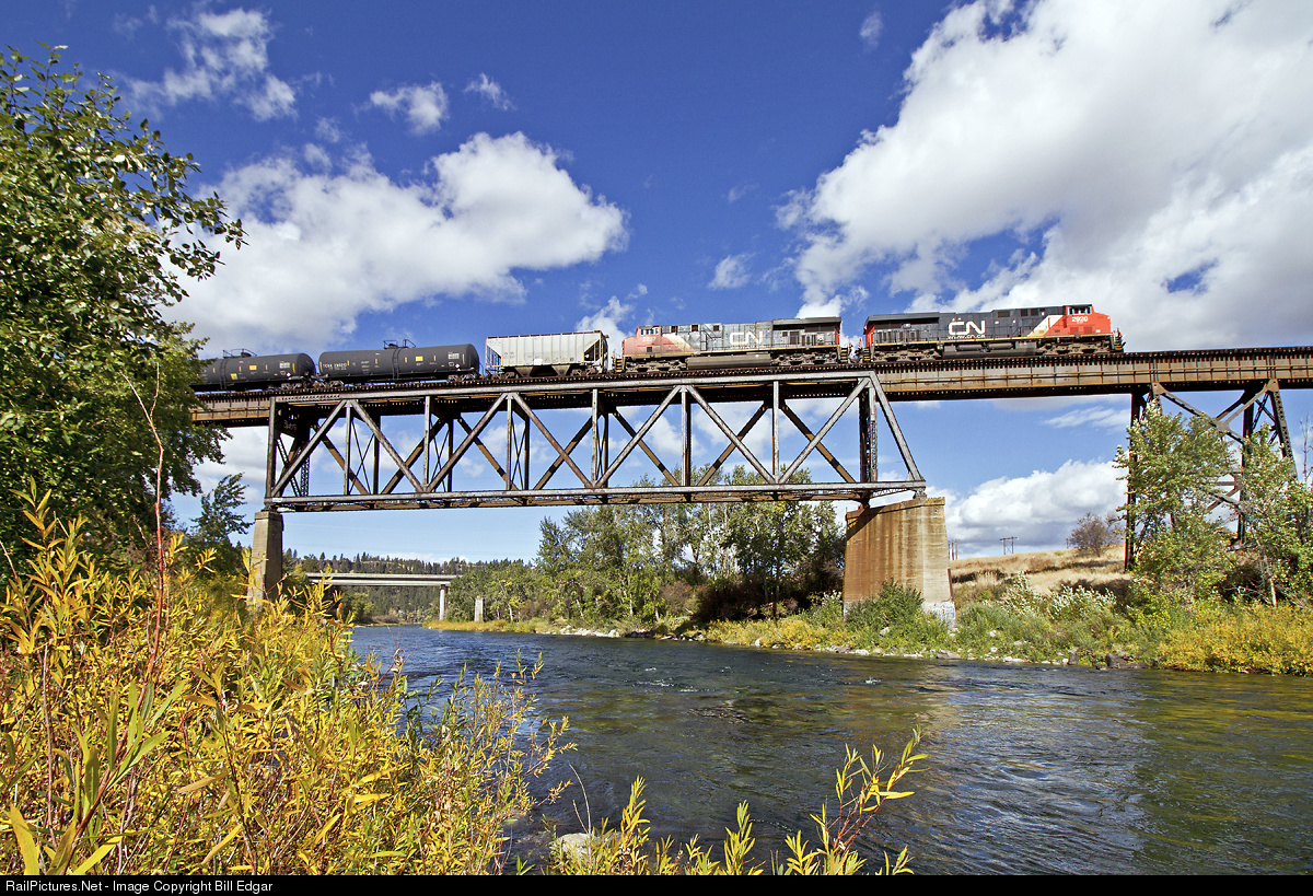 | An oil train rolls east over the Spokane River en route to Hauser Yard behind CN power. This single track bridge sees all BNSF trains entering or exiting Washington state on their east-west main routes. Traffic can reach 40-50 trains a day, including Amtrak's Empire Builder. |