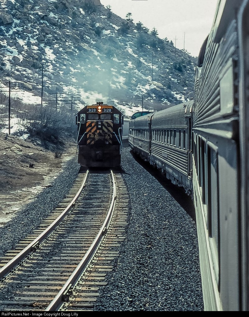 I’ve never regretted any train ride that I’ve taken, although I usually am thinking about the photos that I’m missing while on board the train, and I don’t make a priority of riding for that reason. Knowing that the last traditional passenger train in the country was soon to end, I did make a priority of a few legs of the Rio Grande Zephyr. I made sure to ride in the dome, experience the observation car, and have both dinner and breakfast in the diner, but for me, enjoying the cool air in the Dutch door was the real highlight. Here our eastbound train meets a westbound manifest assaulting Soldier Summit in Price River Canyon, Utah.