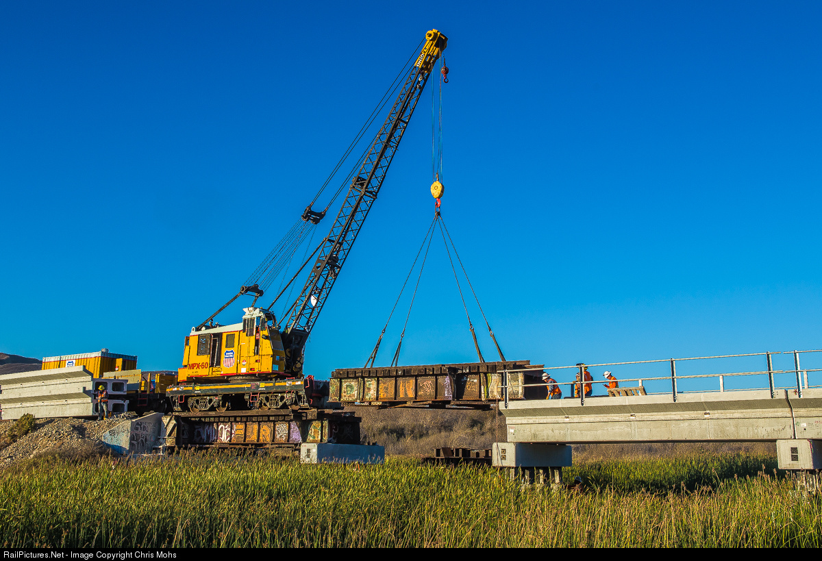 Ohio Locomotive Mobile Crane MPX 60 lifts a section of the last original bridge over the Ventura River. The Coast Starlights No. 11 and 14 were rerouted over Tehachapi Pass. The Surfliners used bus bridges around the work.