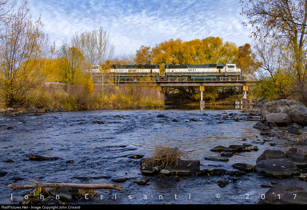 | There is some fall color left as a pair of Burlington Northern painted SD70MACs Nos. 9621 and 9646 cross the Cache La Poudre River in Fort Collins, Colorado on October 27, 2017. |