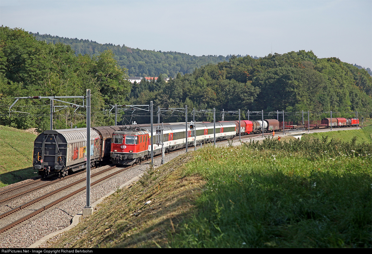 | Intercity 181 Stuttgart – Zürich with Re 4/4 II 11141, a former "Swiss Express" locomotive, meets a mixed freight train RBL (Rangierbahnhof Limmattal) – Kornwestheim with a locomotive class 185. |
