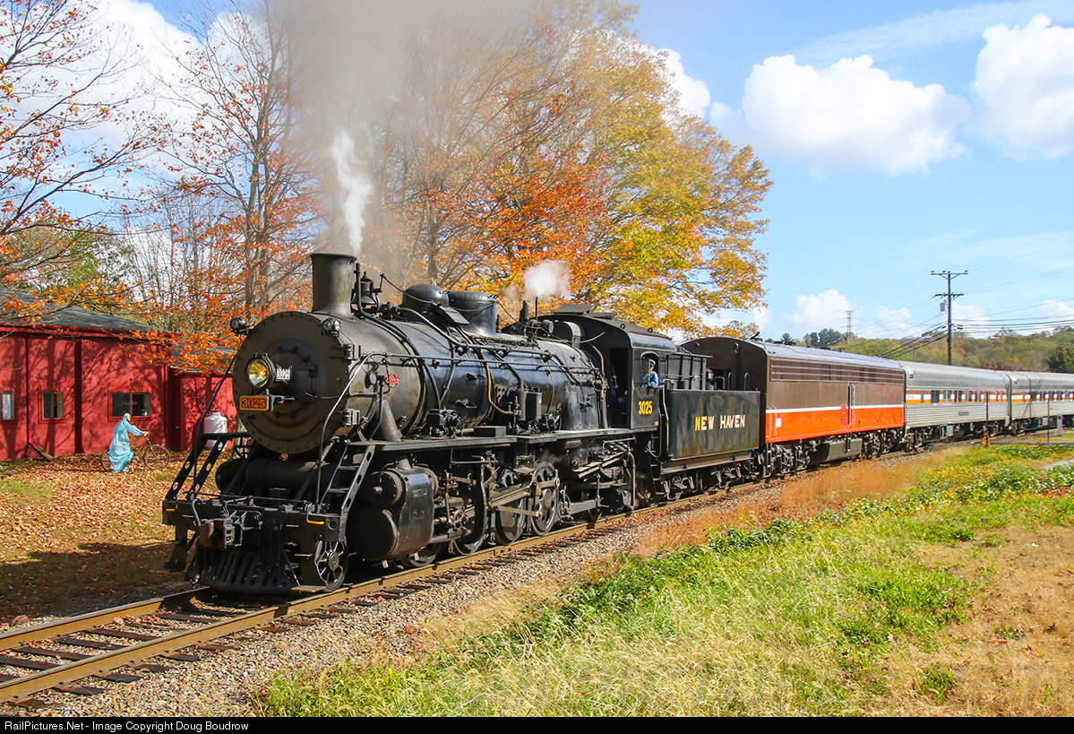On October 28th, 2017 the Mass Bay Rail Enthusiasts chartered a day long passenger excursion from Worcester, MA using Providence & Worcester locomotives 4005, 4004 and their office car train to Old Saybrook, CT. Since Gennesse & Wyoming has bought the P&W the days of the orange and brown diesels are limited as the G&W paint scheme is being applied to all of their locomotives. At Old Saybrook the Valley Railroad picked up the train from the Providence & Worcester power and brought the train all the way up their operable track to Haddam using their New Haven replica Mikado #3025. After the return trip to Old Saybrook the P&W power brought the train home to Worcester. Here #3025 passes through Essex.