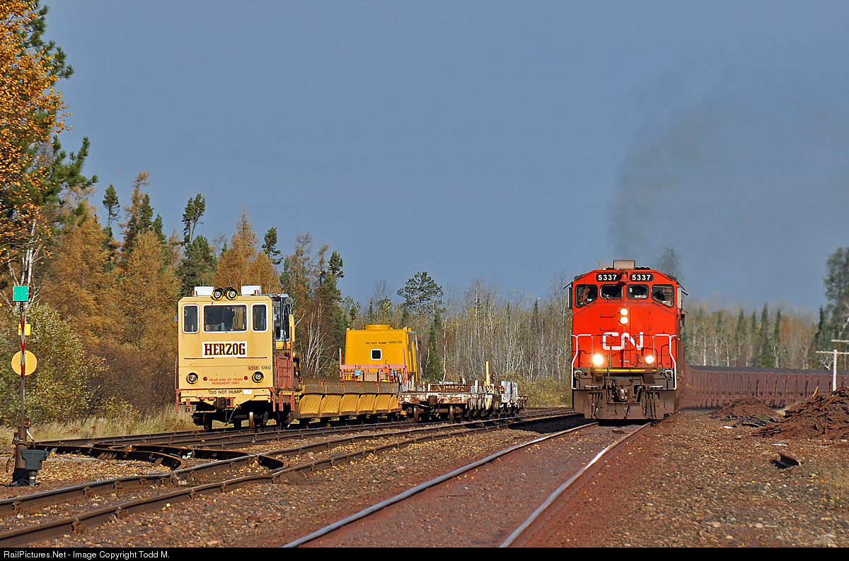 A quartet of SD40-2W's with taconite pellets in tow rumble southward through the small community of Allen Jct. passing by some M.O.W. equipment being stored in the small yard located there.
