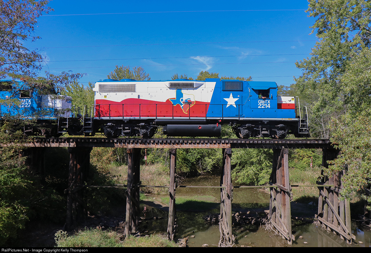 GMTX 2214 (GP38-2) leads a Decatur Central train north over the old wooden bridge in Argenta, Illinois
