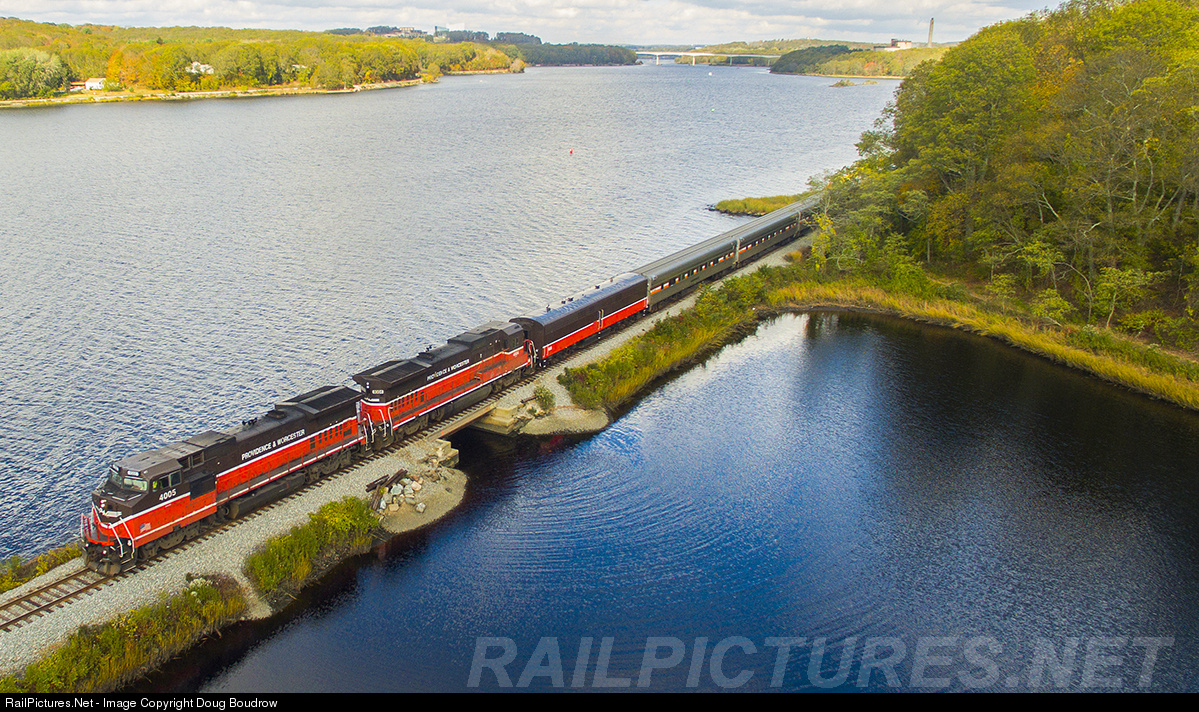 On October 28th, 2017 the Mass Bay Rail Enthusiasts chartered a day long passenger excursion from Worcester, MA using Providence & Worcester locomotives 4005, 4004 and their office car train to Old Saybrook, CT. Since Gennesse & Wyoming has bought the P&W the days of the orange and brown diesels are limited as the G&W paint scheme is being applied to all of their locomotives. At Old Saybrook the Valley Railroad picked up the train from the Providence & Worcester power and brought the train all the way up their operable track to Haddam using their New Haven replica Mikado #3025. After the return trip to Old Saybrook the P&W power brought the train home to Worcester. Here the train rolls along the Thames River in Gales Ferry.