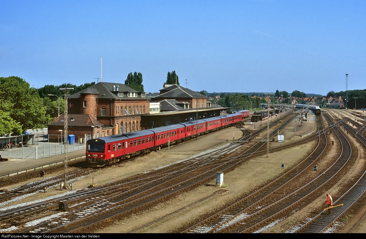 | DSB MR 4050 / MRD 4245 , MR 4032 /MRD 4232 and an unknown trainset had just left Nyborg as Re 3124 Aalborg - Nyborg Fgh. In the background MFA 5056 / FF 5456 / MFB 5256 "Jørgen Fibiger / Hirtshals", MFA 5008 / FF 5408 / MFB5208 "Absalon / København" and MFA 5011 / FF 5411 / MFB 5211 "Mylius Erichsen / Ringkøbing". that train had just left the ferry and was under way as IC 125 from København H to Aalborg and Sønderborg. Trains are not coming here since the tunnel under the Storebælt has opened. The tracks are gone and the viaduct on which I stood is demolished. The station building is still there.