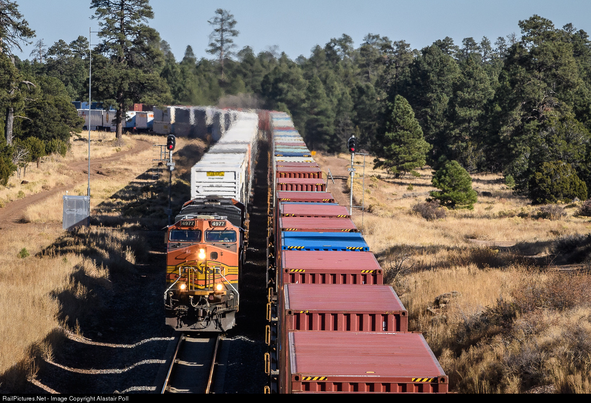 | As an eastbound intermodal races towards Winslow, BNSF 4977 crawls up the grade towards the summit of the Arizona Divide leading a long westbound intermodal through Walnut Canyon just east of Flagstaff, AZ. |