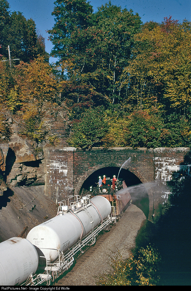 A weed sprayer train enters Shoofly Tunnel near Fort Hill, PA. Unfortunately, the spray operator on the right was so intent on the work, he didn't get the sprayers turned off before they entered the tunnel. Everyone got soaked!