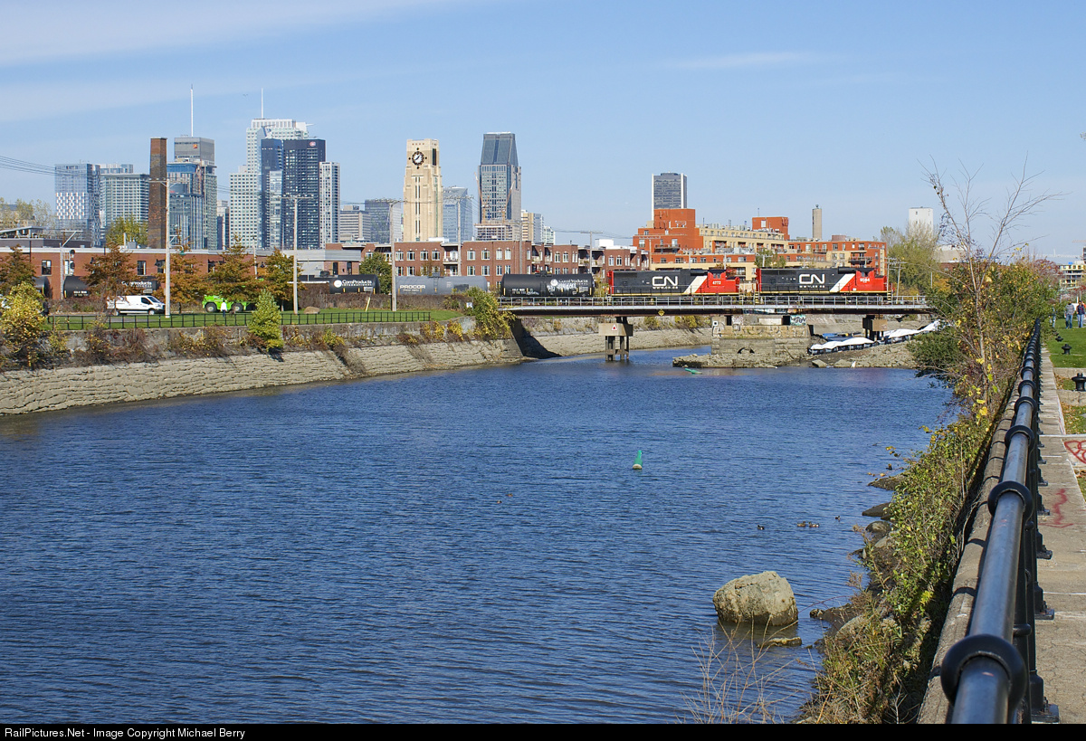 Clean widecab geeps. A pair of surprisingly clean and repainted widecab geeps (CN 9584 & CN 4772) lead CN 586 with mixed freight as well as empty TankTrain cars from Brockville over the Lachine Canal about ten minutes after QGRY detour CN F900 passed.