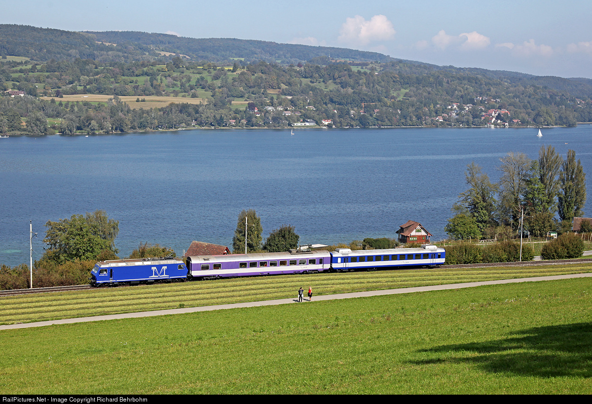 | Re 456 111 of Müller Gleisbau (M-Rail AG) heads a charter train along a part of Lake Constance. The first car is a former SBB dining car, the second one the "Salon Bleu" of BLS. Both cars are operated today by Swiss Rail Car Management". |
