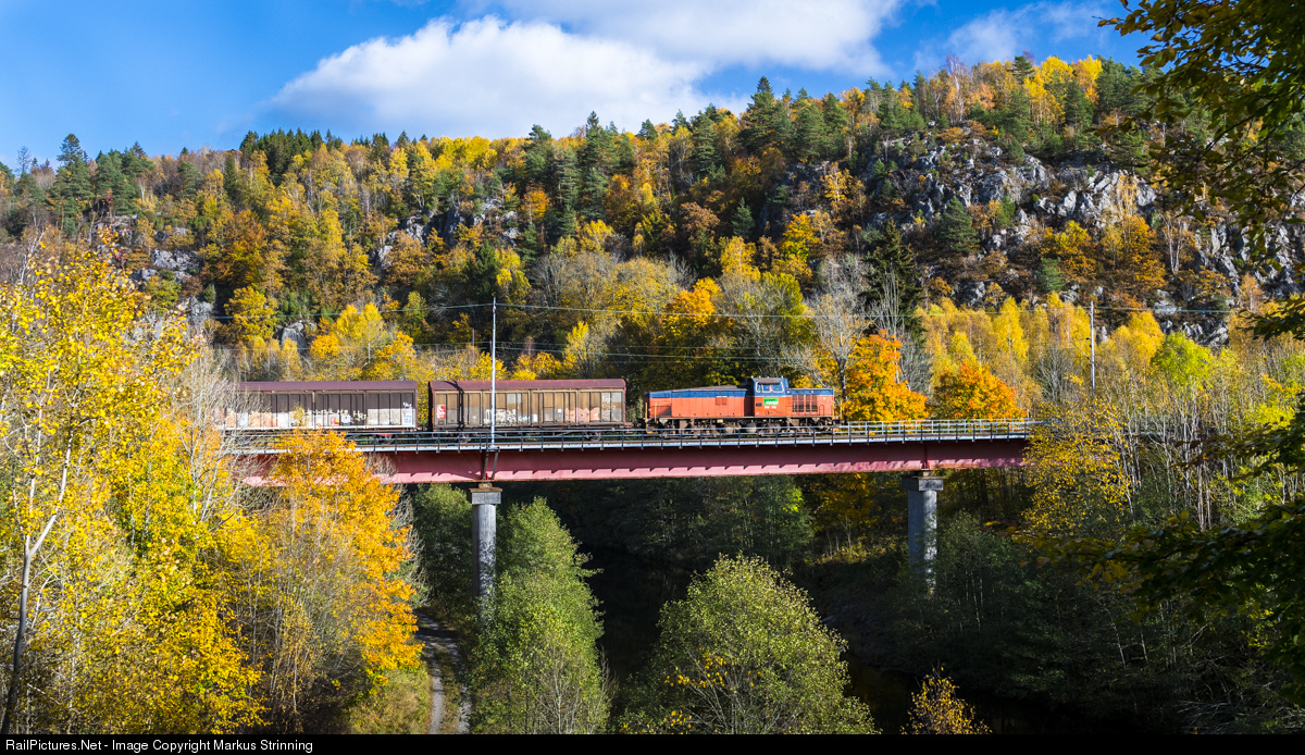| Green Cargos T44-342 with a freight train crossing Örekils river on Munkedal-Uddevalla line. The T44 locomotive is the most common diesel locomotive on Swedish railways. Used for shunting and light freight trains. |