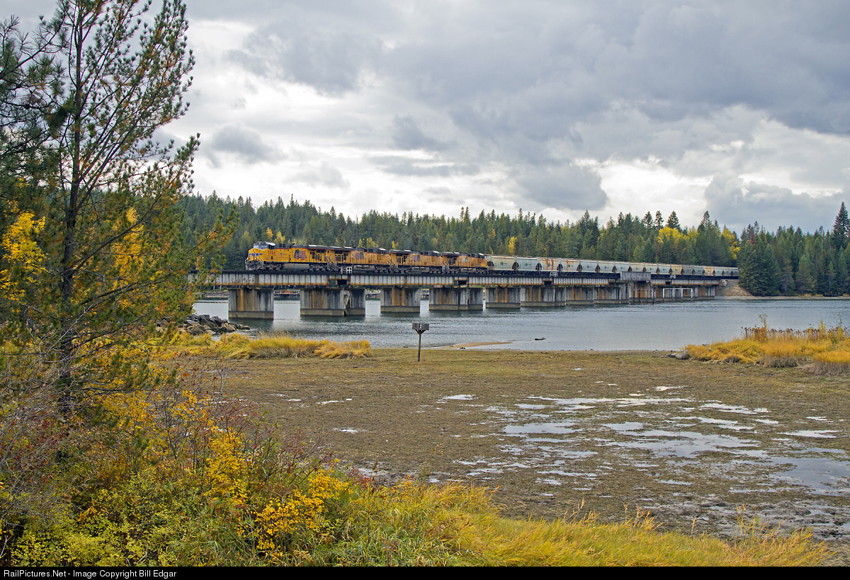 | UP 5524 leads a quartet of GEs and an empty Canpotex train across the Pend Oreille River at Dover, ID west of Sand Point, ID. Dover is a junction with the Pend Oreille Valley Ry. which operates from Newport, WA to Dover on former Great Northern right of way. UP/POVA share the former GN under UP ownership a couple miles in to Sandpoint and POVA's junction with BNSF. |