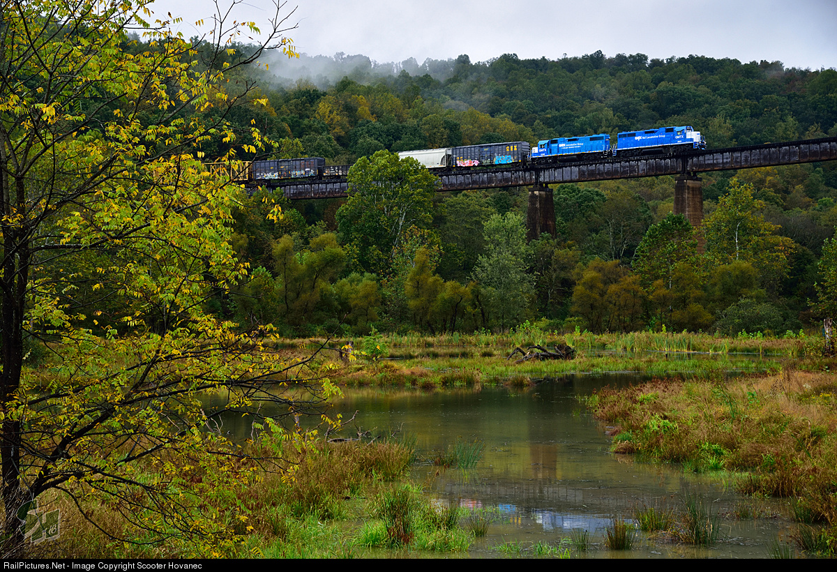 | "Quick Dispatch" freight rolls south across the Pleasant Creek Viaduct as a light mist falls in the hills of West Virginia. The crew started out at Buckhannon earlier in the day, travelling north to Grafton for interchange with CSX, and is now heading back south along the Cowen Sub. |