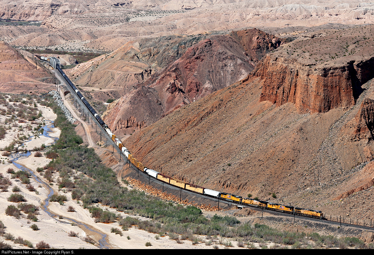 On a beautiful spring morning eastbound tonnage comes away from the 'middle' bridge crossing of the Mojave River in the heart of Southern California's Afton Canyon. Just east of the 'middle' river crossing is the former location of tunnel 1, daylighted long ago.