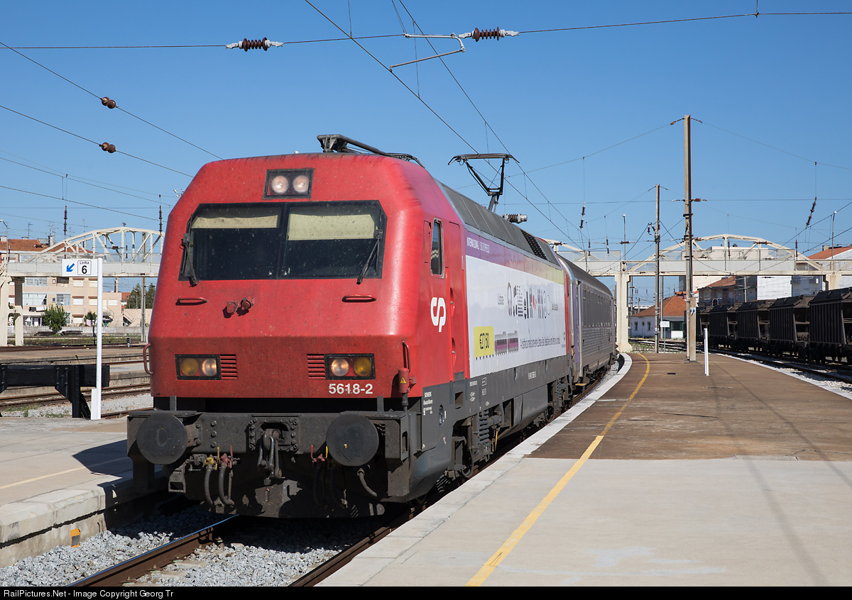 Siemens Eurosprinter class 5600 # 5618 of the Comboios de Portugal, entering Entroncamento on the portuguese norths-south mainline with an "Intercidades" train from Porto Campanha to Lisboa Santa Apolonia. 30 of the 5600 class were built from 1993 to 1995 by Siemens, KraussMaffei and Sorefame (Sociedades Reunidas de Fabricações Metálicas) at Amadora/Portugal for the Caminhos de Ferro Portugueses (today called Comboios de Portugal). The 86 ton locomotives for 25000 V 50 Hz AC, with 5600 Kw can run 220 km/h on the iberian broad gauge of 1668 mm. Some of this series are now running in freight service for the Medway Logistics, the former CP Carga.