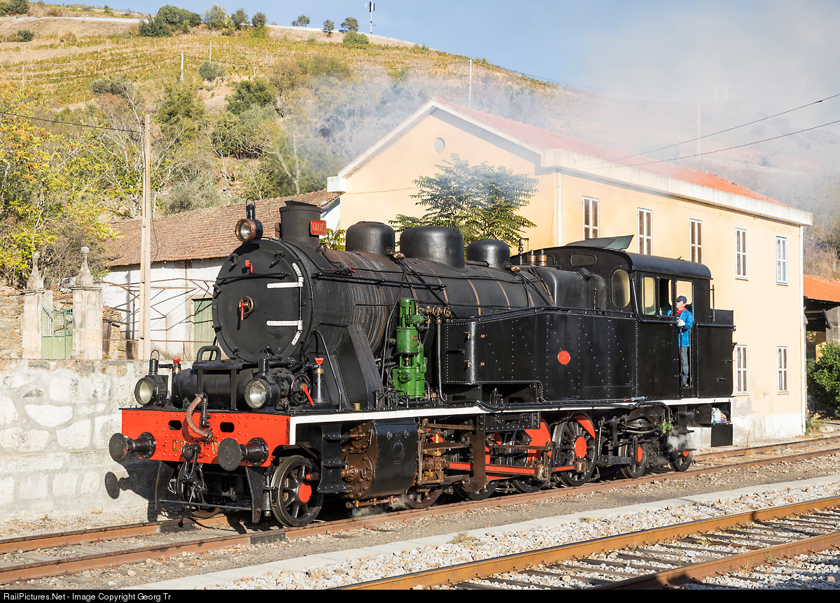 Heavy 2-8-4 tank steamlocomotive of the Comboios de Portugal at Tua. The locomotive was built in 1925 by the german Henschel & Sohn at Cassel for the Companhia dos Caminhos de Ferro do Sul e Sueste (SeS), which became later the Caminhos de Ferro do Estado (CFE), now Comboios de Portugal (CP). From 2013 to 2016 it was converted to burn light oil (diesel) and is regularly used for the tourist train between Régua and Tua along the Douro river on weekends from june to october. The locomotive is running back from the turntable at Tua to her train of 5 vintage twoaxle cars, for the return journey along the Douro river to Régua.
