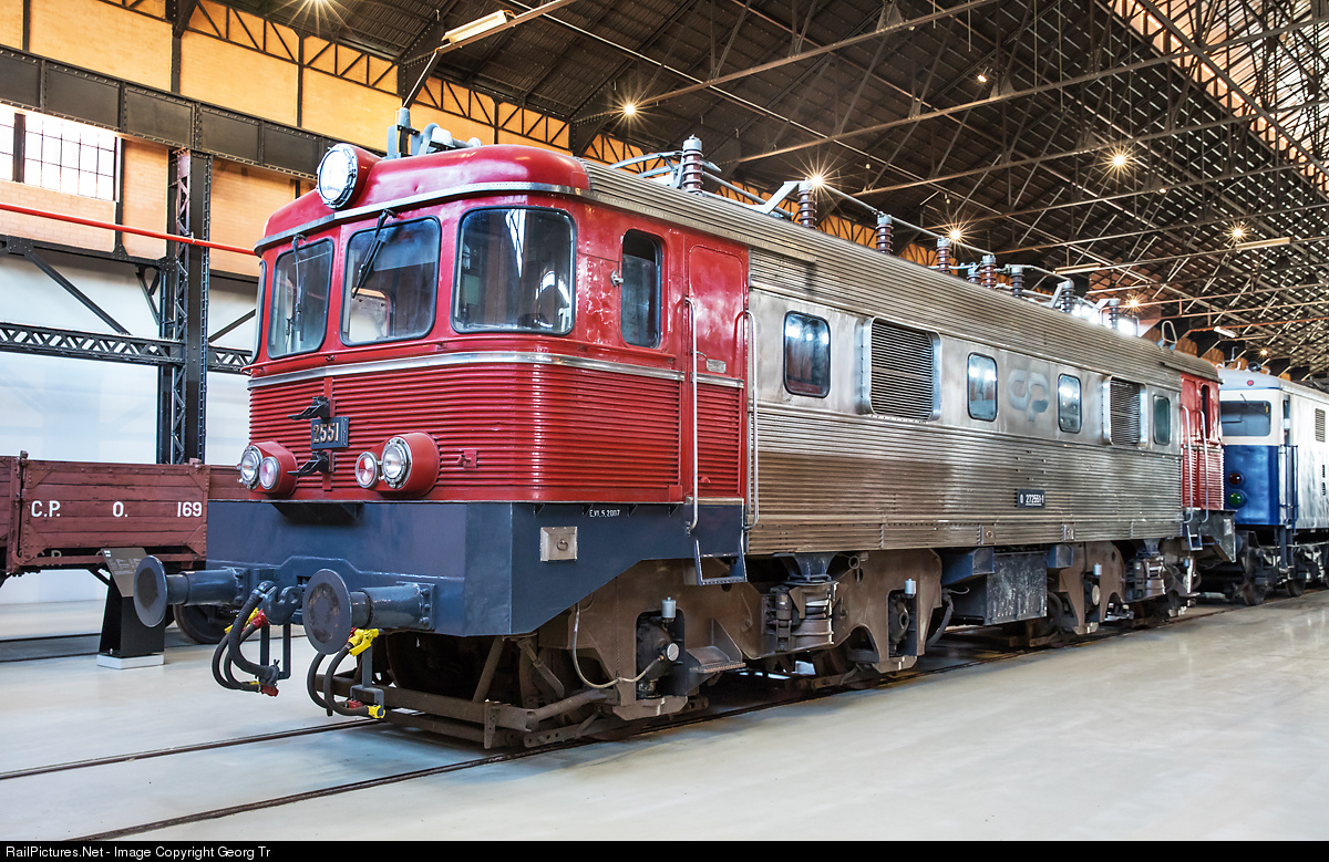 Broad gauge electrolocomotive # 2551 of the Comboios de Portugal (CP) in the railway museum of Entroncamento. 20 of this type for 25000 V 50 Hz AC were built in 1963/64 by 50-Hz-Arbeitsgemeinschaft, Henschel and Sorefame, with 2080 kW and 120 km/h velocity, mainly for the traffic between Lisboa and Porto. The body of the locomotive is of stainless steel after a Budd patent. They were withdrawn till 2012.