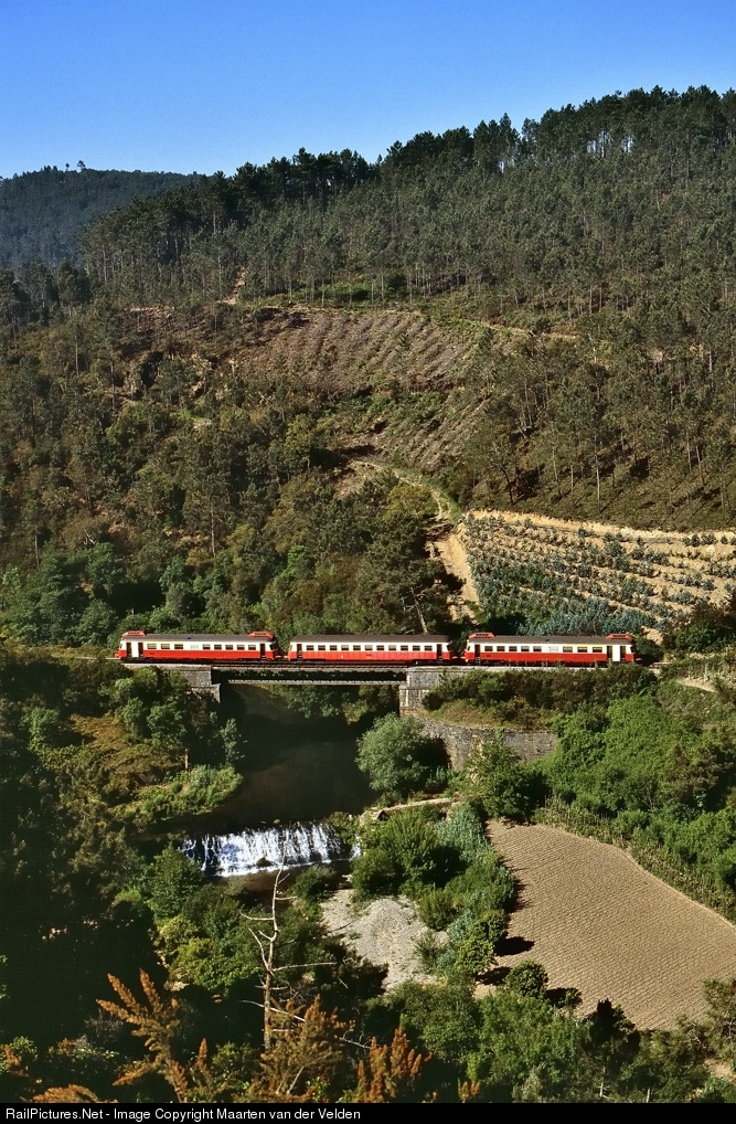| CP 313 and 307 with intermediate trailer 22-29 307 are passing a viaduct near Vale de Açor on their way as Regional 2855 from Coimbra Parque (ap.) to Miranda do Corvo.