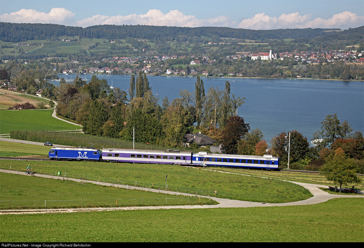 | Re 456 111 of Müller Gleisbau (M-Rail AG) heads a charter train along a part of Lake Constance. The first car is a former SBB dining car, the second one the "Salon Bleu" of BLS. Both cars are operated today by Swiss Rail Car Management". |