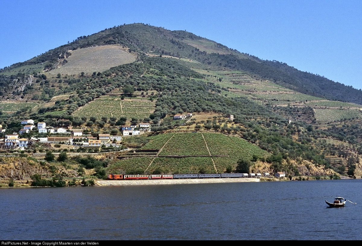 | CP 1405 approaches Covelinhas with IR 860 from Pocinho to Porto São Bento. Notice the presence of four freight wagons in this train. On the right a "Barco Rabelo", a for this region tipical boat what was formerly used for transporting the famous portwine to Vila Nova de Gaia.