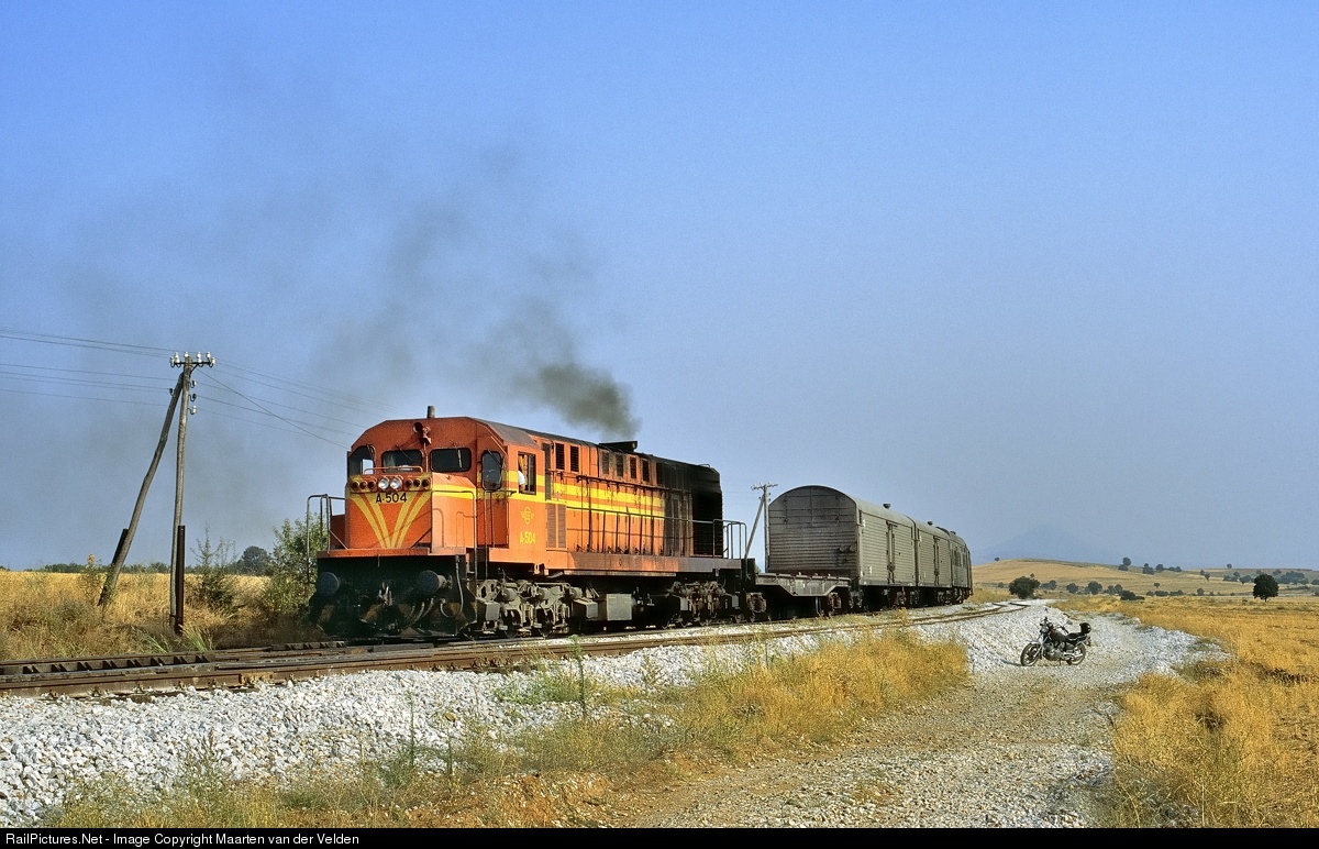 | OSE A.504 is entering the station of Kilkis with a freight teain from Russia. The bike belongs to the guardsman who has to operate the points at both sides of the station and allows him a swift transport to the other side.