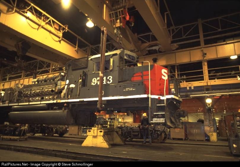 Shop workers at Burnham lower SP GP60 9743 onto steel horses preparatory to her receiving rebuilt trucks.