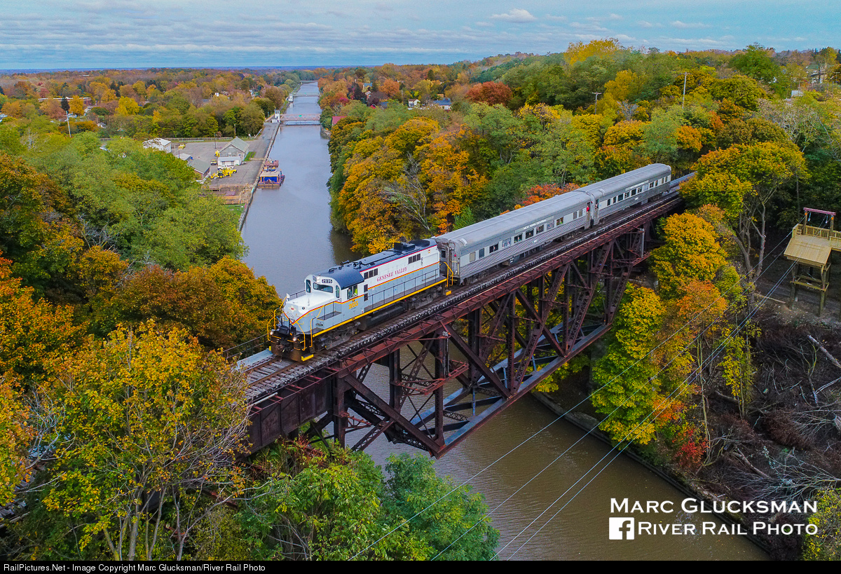 Crossing the Erie Canal. The Genesee Valley Transportation Falls Road Railroad operated a passenger special with the Niagara Frontier Chapter of the NRHS on Saturday, November 4, 2017 from Lockport , New York to Brockport, New York. On the return trip, we catch 2035 (ex-New York Central Railroad 8035, Also RS32, 6/1962) cab forward crossing the Erie Canal in Lockport with telltale charter white flags flying. This units single pane front windshield was an unusual feature of the RS32s.