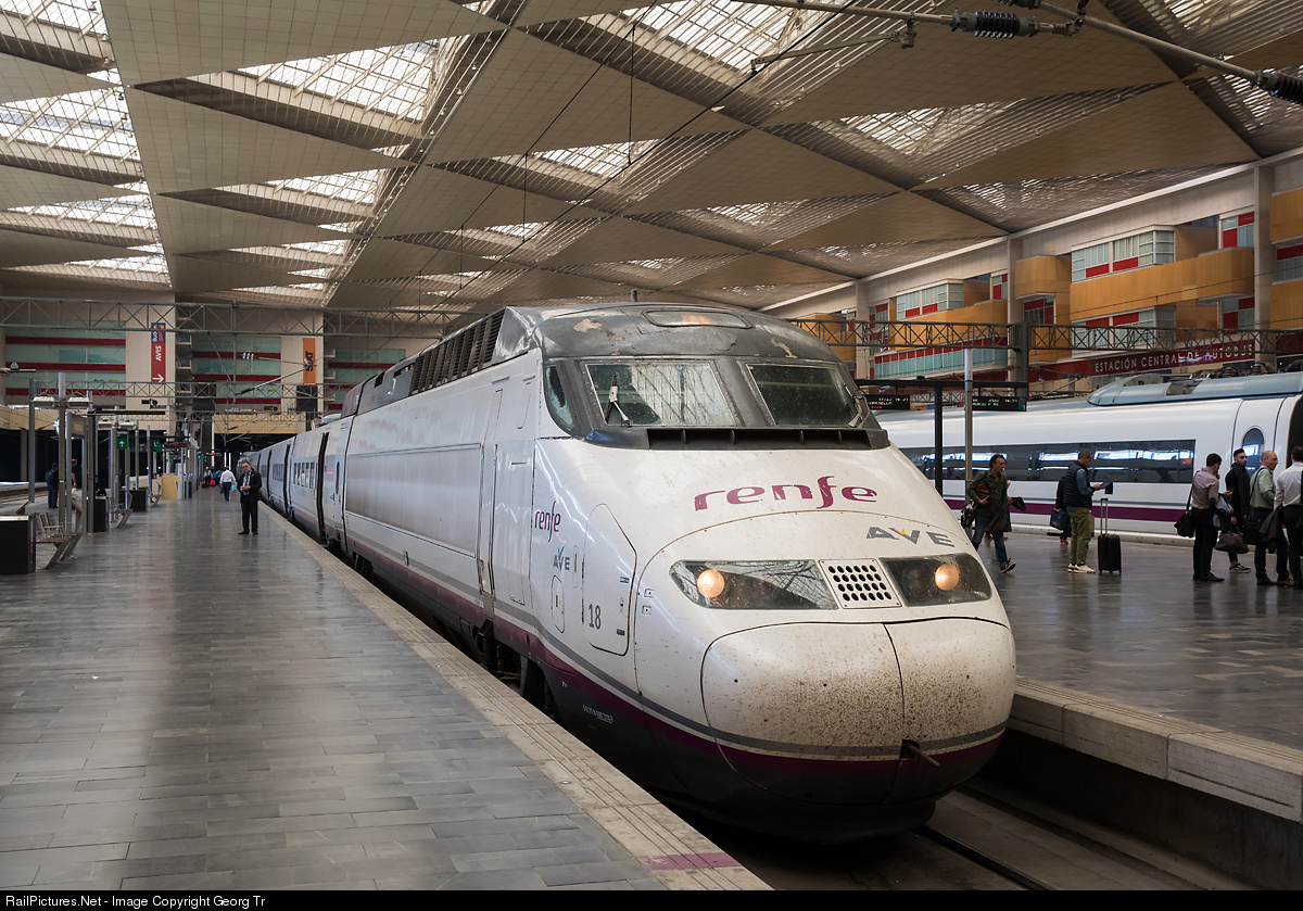 | Spanish high speed train "AVE" (Alta Velocidad Española) series 100 # 018 of the RENFE in Zaragossa-Delicia station, ready for departure as train 9724 to Marseilles/France. The 100 series for up to 300 km/h were built from 1992 by Alstom and CAF and are directly derived from the TGV Atlantique that runs in France. |