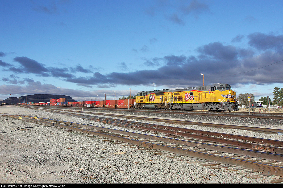 | UP 7172 in fresh paint awaits to depart Yermo eastbound, but PTC issues have delayed this and will force the train to meet several westbound's once the issue was resolved. |