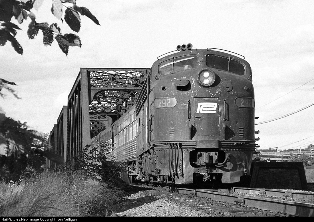 On its way from Boston to Albany, the Boston section of the Lake Shore Limited rolls off the Connecticut River bridge and into West Springfield, MA, on a summer afternoon. E8 292 changed hands from Penn Central to Amtrak just a few weeks earlier, and it has received its new number but not yet a new paint job.