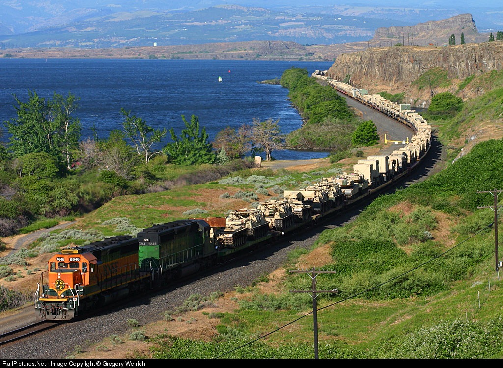 I train of military equpiment heads East long the Columbia River.