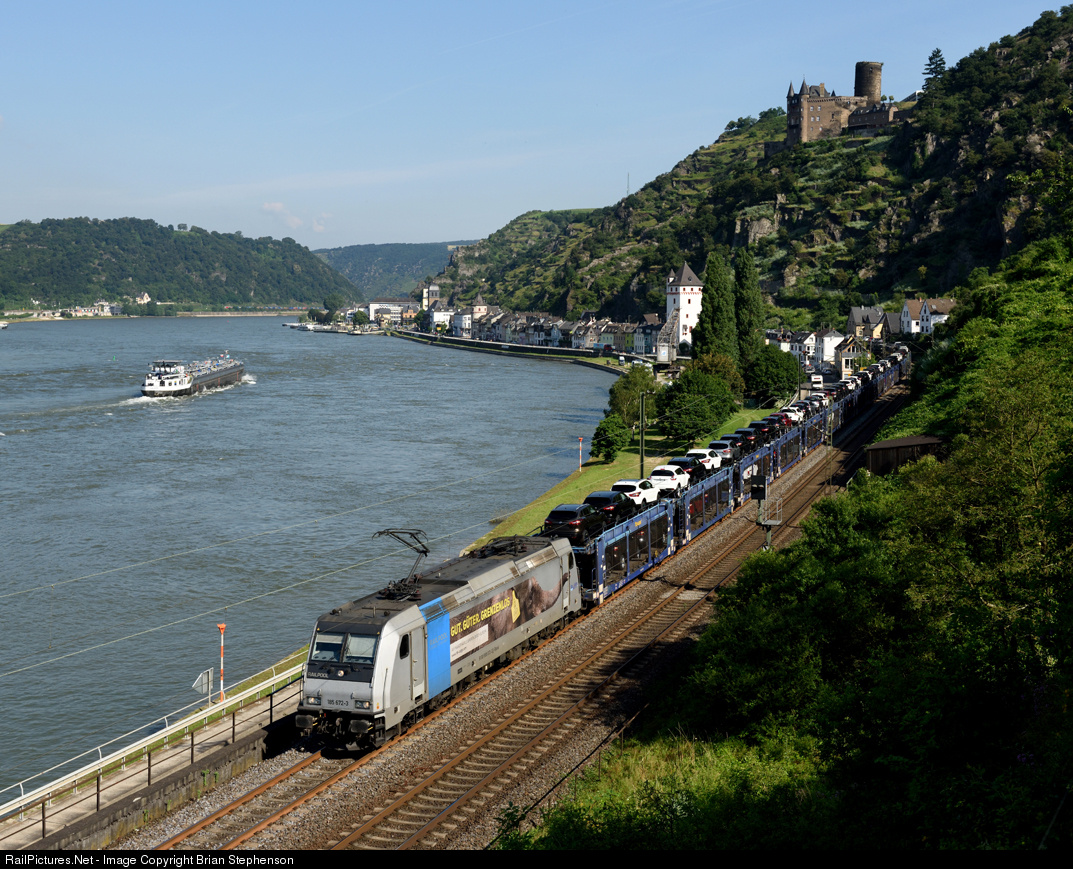 | A Railpool 185 passes Sankt Goarshausen on the east bank of the River Rhein with a southbound train of new cars. Burg Katz can be see above the train. |