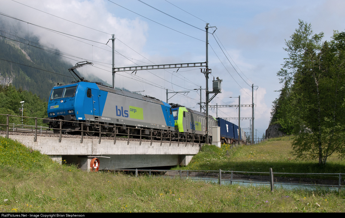 | Hired from Alpha Trains Bombardier Traxx F140AC Bo-Bo No 185 527-9 and similar BLS Cargo Traxx F140AC1 No Re 485 011-1 approach Kandersteg at the summit the climb from Frutigen on the Lotschber north ramp with a southbound container train to Italy. The train was being banked by hired No 185 535-2. Both these hired locos are now with X Rail. |