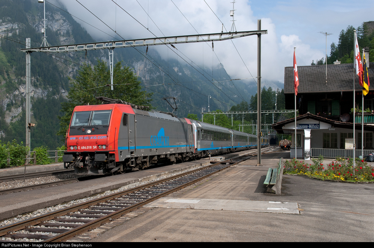 | SBB Cargo Bombardier TRAXX F140MS2 Re 484 Bo-Bo electric No E 484 018 SR passes Blausee-Mitholz station with train EC130, the 06.25 Milan Central to Basel SBB. These locos were used before the introduction of the ETR 610 tilting trains on this route as they could work through from Basle/Zurich to Milan. The attractive Blausee-Mitholz station was virtually closed at this time with only one service stopping at night. |