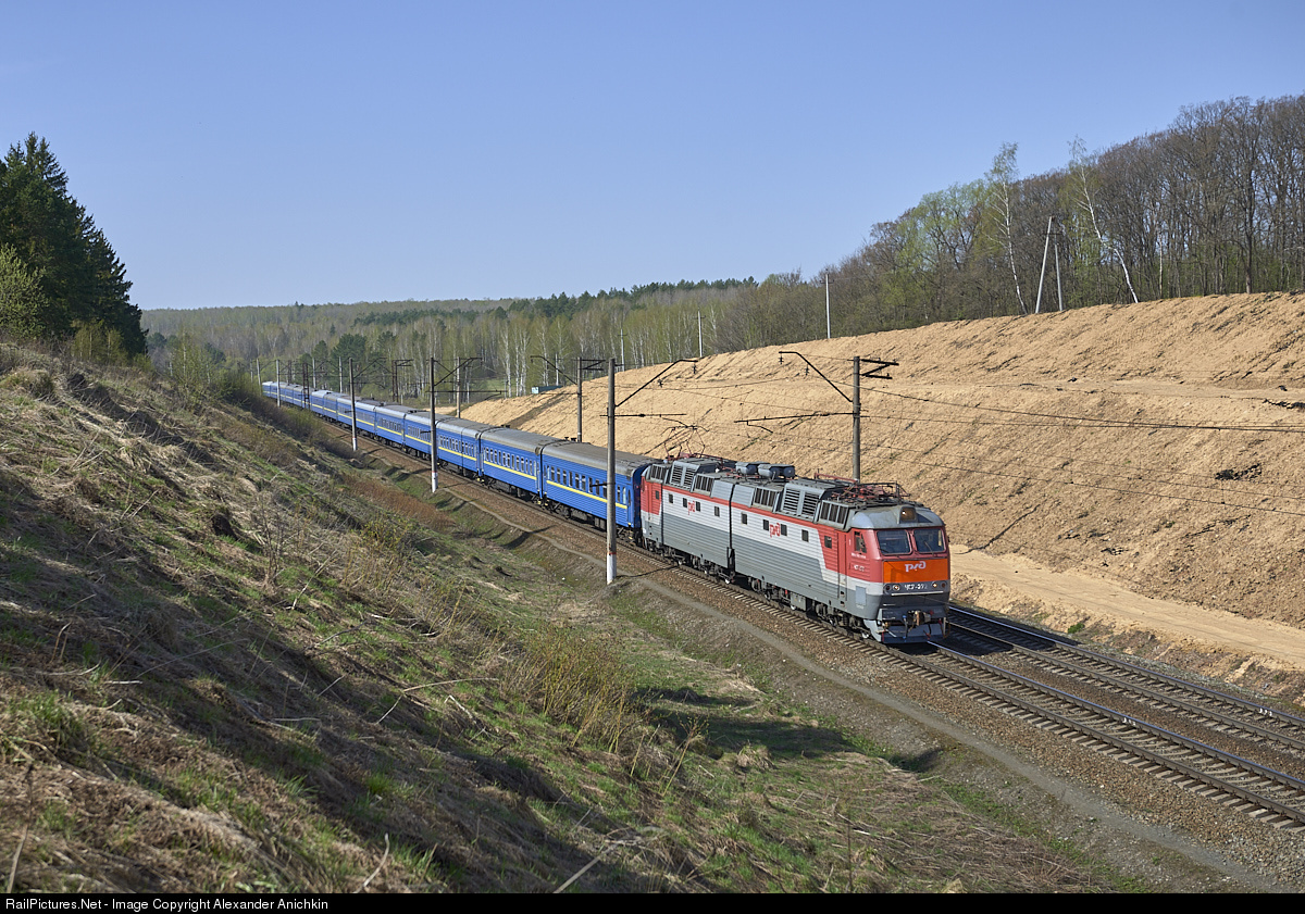| ChS7-272 DC locomotive operated by Russian Railways with a passenger train of the Ukrainian Railways from Dnepropetrovsk to Moscow in the vicinity of Serpukhov |
