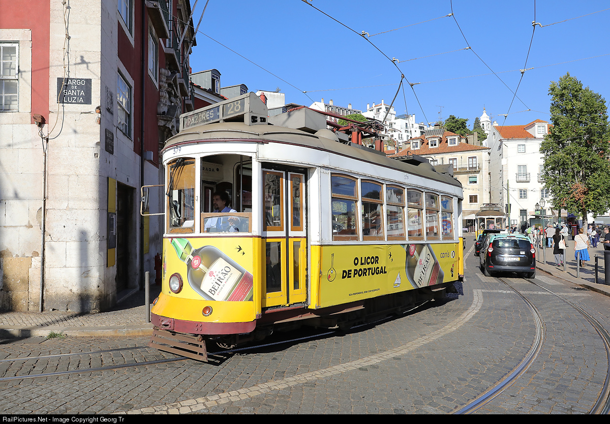Vintage tram # 579 of Carris, the tram system of Lisboa (Eléctricos de Lisboa), running on the line 28 to Prazeres round the sharp curve at Portas do Sol. This is one of the "Remodelado" type, built between 1935 and 1940 and completely rebuilt with new electric system from Kiepe and new frames from MAN between 1995 and 1996. Carris is operating 45 of this modernised 2 axle trams with wooden carbody, they circulate on the lines 12E, 18E, 25E und 28E, and 15E in the evening hours.