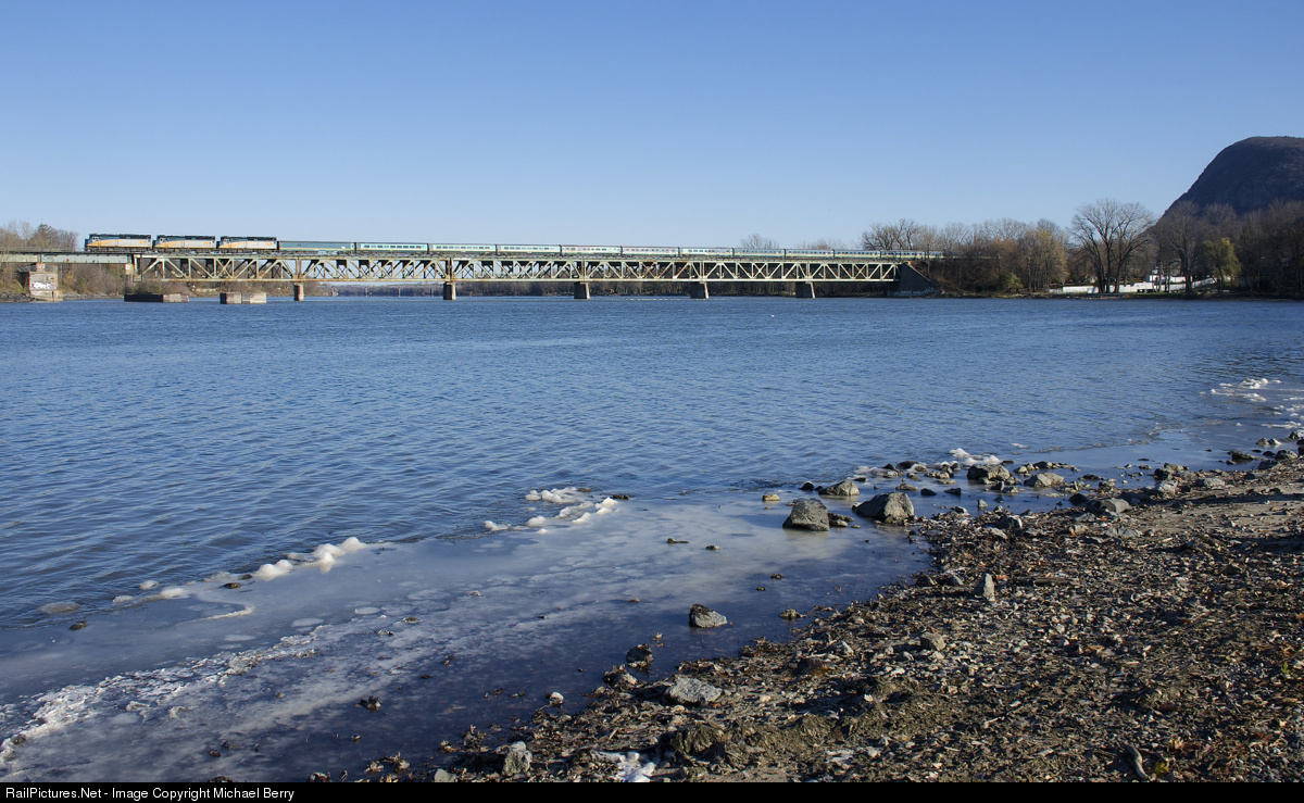 | Over the river on a cold fall morning. A trio of F40's (VIA 6417, VIA 6431 & VIA 6452) lead VIA 15 from Halifax over the Richelieu River on a very cold fall morning. At right is part of Mont Saint-Hilaire. |